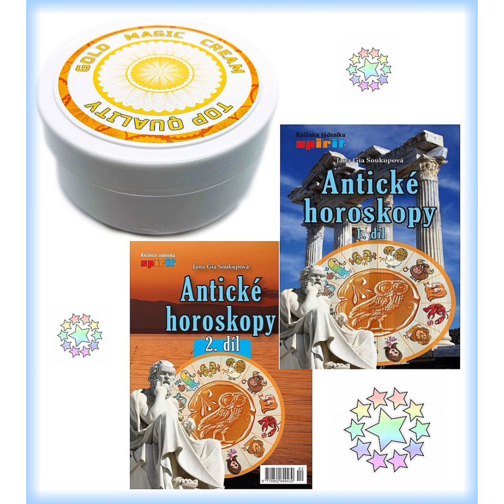 Balíček obsahující mandlový pleťový a tělový zvláčňující krém Magic Gold a dvoudílné vydání Antických horoskopů.